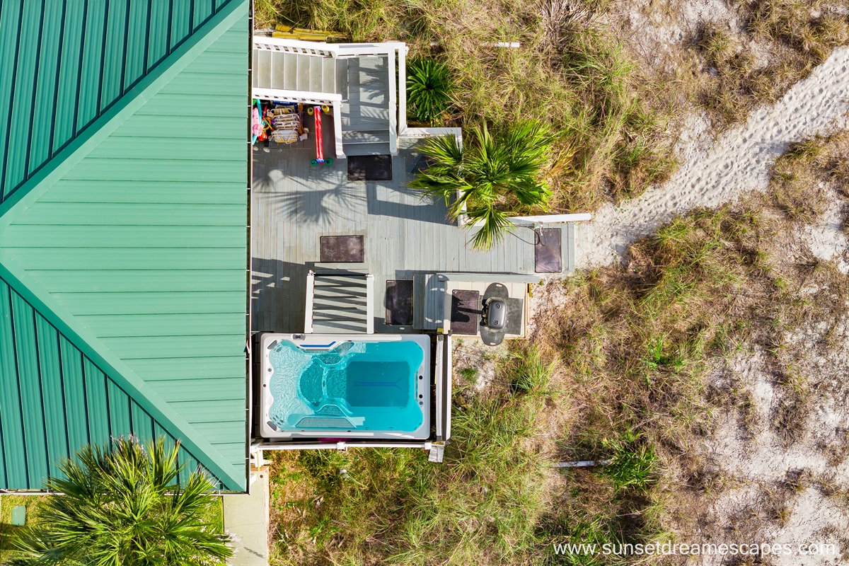 Views of the lower deck, SwimSpa, and dunes.